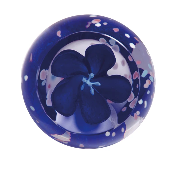 Delicate blossoms in calming blue hues are suspended within this handmade glass paperweight. Meticulously crafted using the millefiori technique, soft petals and leaves encircle the sapphire floral centre. An elegant accent piece for any space.