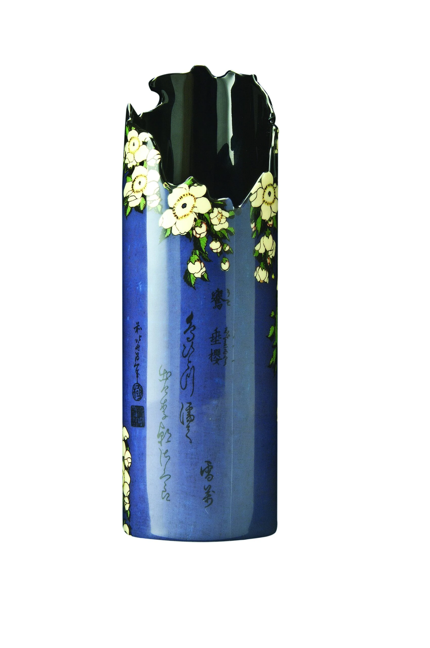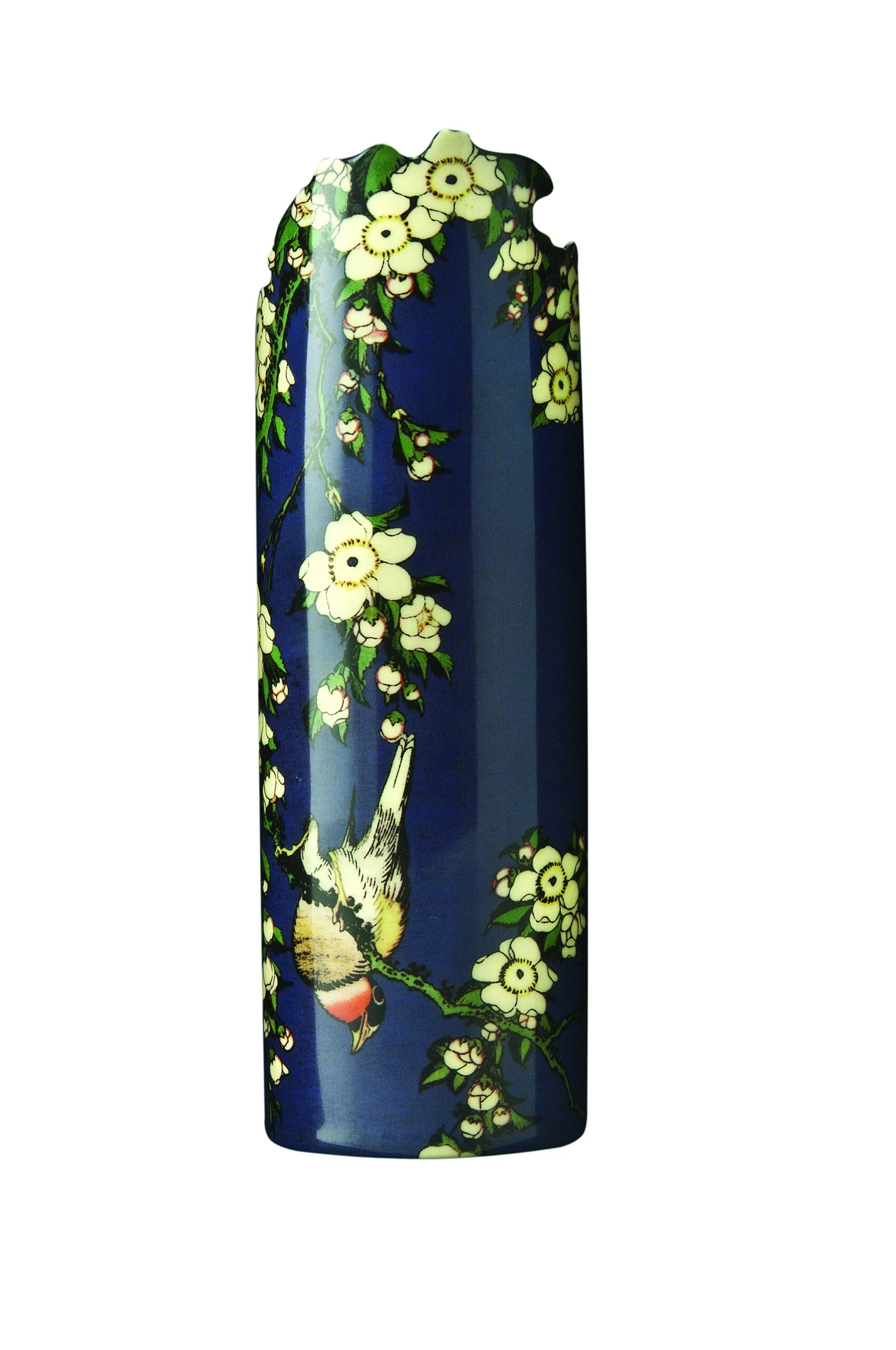 A sweeping cherry blossom frames a small poem whilst a small bird nestles into the branches. The intense blue colour is the perfect contrast of the neutral tones of nature.