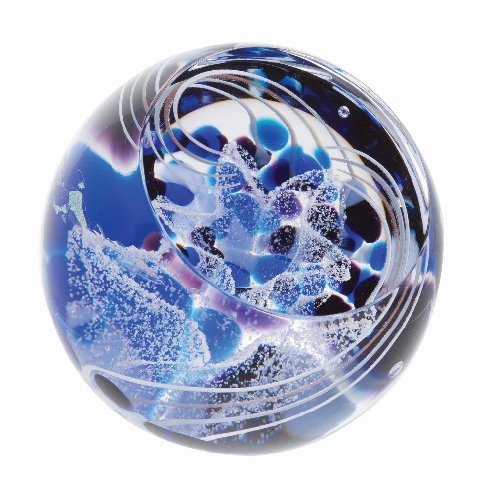Make a wish on the lone star embryo suspended in this cosmic paperweight. Meticulous hot glass sculpting creates a glittering starburst swirl of silver glass against an inky night sky backdrop. A handcrafted treasure from Caithness artisans, this galactic accent makes an uplifting gift.